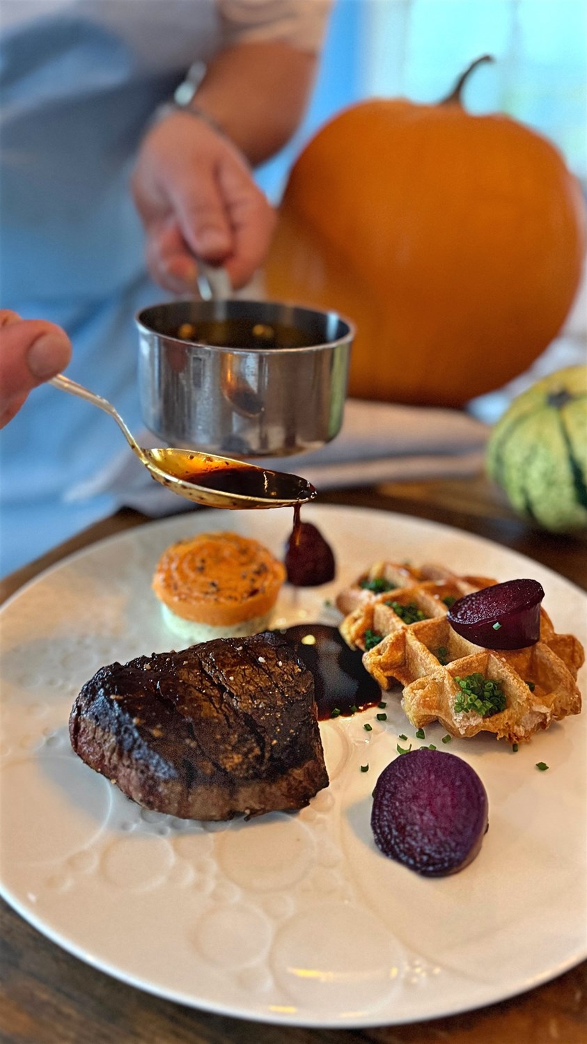 cremet kartoffelgratin, bagte rødbeder samt stegt kejserhat.